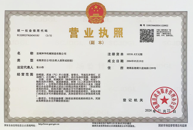 鹽城神華機械制造有限公司為中國石油、石化、海洋物資裝備(集團)總公司的網(wǎng)絡成員單位,公司注冊資金10558.8萬元整,公司通過了ISO9001國際質(zhì)量體系認證,取得了中國船級社船舶產(chǎn)品和配件使用證書。
